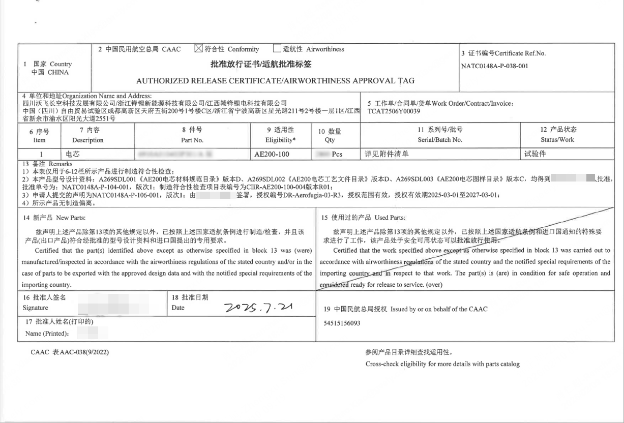 此次合作是基于双方在各自领域的深厚积累和高度互补的资源优势。沃飞长空作为国内eVTOL领军企业,具备领先的整机研发、验证与适航经验。前不久,沃飞长空已经完成了AE200-100量产机第一阶段验证试飞,适航取证进程不断向前。作为需求端,沃飞长空将持续向赣锋锂业输出符合航空级安全标准的电芯性能指标和试验数据,以需求牵引技术创新。